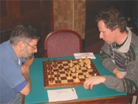 Aan bord 8 speelde Jaap Kramer met de zwarte stukken. Na de openingsfase stond Jaap totaal hopeloos en het wachten was wanneer hij zou opgeven. Jaap zag dit zelf ook in en probeerde zijn stukken te activeren en nog enige trucjes in de stelling te vlechten. Om dit te bereiken gaf hij drie pionnen weg en kreeg een sterk paard op d4. Zijn tegenstander speelde (mijns inziens) veel te passief, ondanks de grote overmacht van materiaal, en liet zich door Jaap beet nemen. In de slotstelling was hij gedwongen eeuwig schaak te geven of anders ging hij mat! Kortom, onverwacht een remise aan bord 8 (3˝ - 2˝ achter).