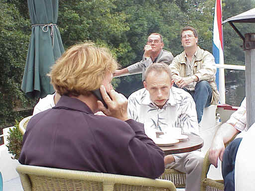 Erna belt even of het goed gaat met de kids. Peter fronst. Hajo de Vries en Marcel Sondervan op de achtergrond.